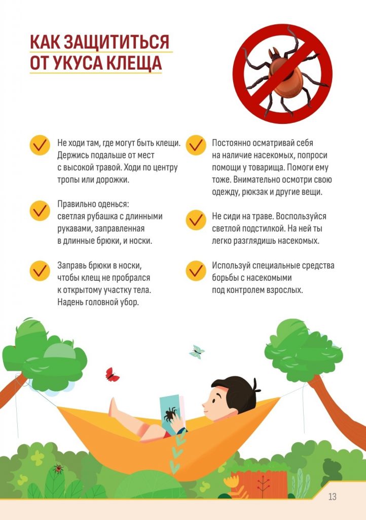 ✅ При выходе на природу одеться так, чтобы минимизировать доступ клеща к телу: носить куртку с капюшоном, ворот рубашки плотно пристегнут, цвет одежды однотонный светлый, так как на ней легче заметить клеща, манжеты рукавов плотно прилегают к руке, рубашка заправлена в брюки, а штатины – в ботинки или носки.