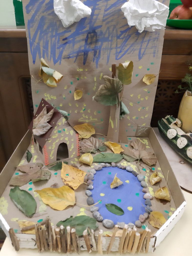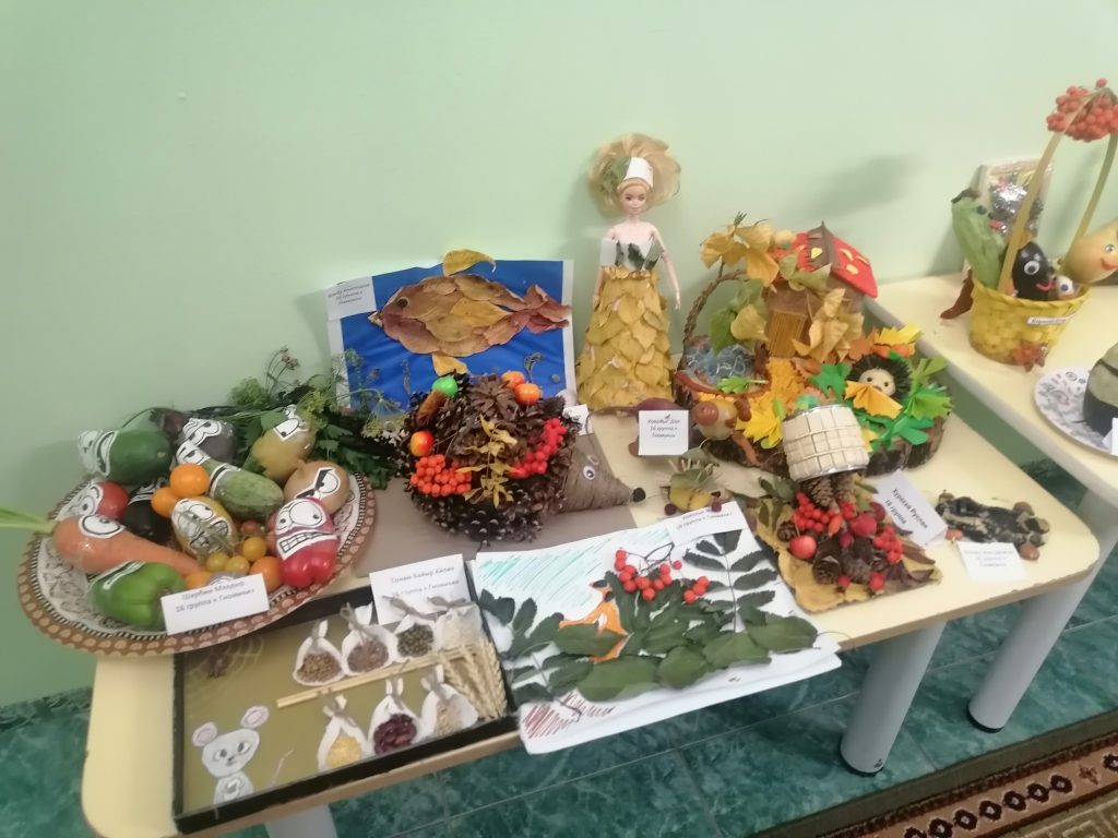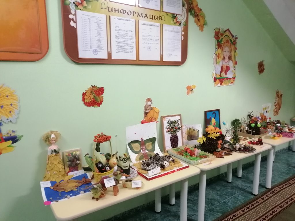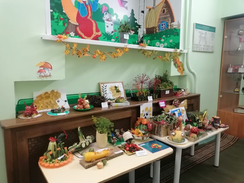 Выставка проходила в течение двух недель в холле детского сада. В своих работах ребята использовали разные природные материалы – шишки, листья, цветы, веточки, мох, овощи, фрукты и т.д. На выставке были представлены лесные композиции, осенние сказки, игровые ситуации, панно, игрушки и многое другое.