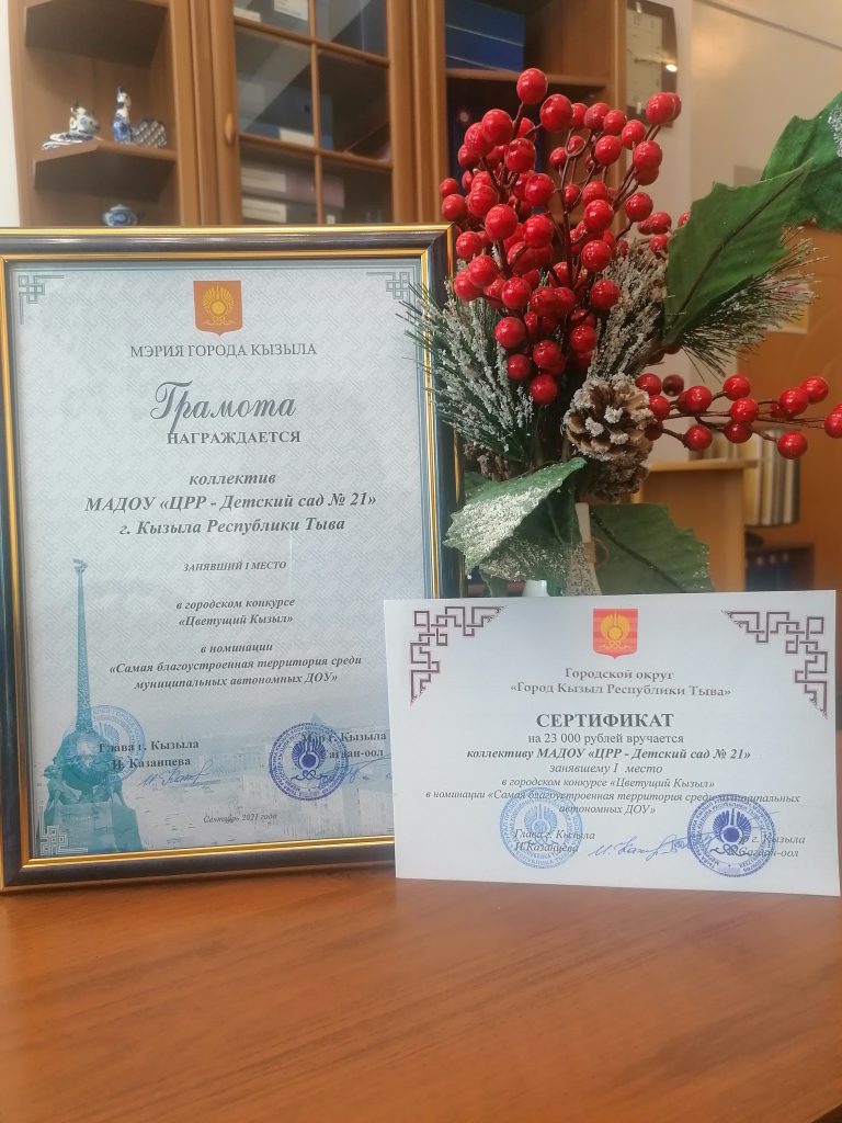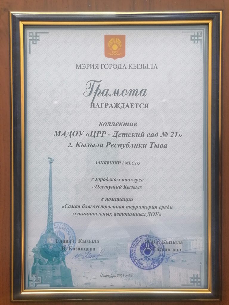 Наш детский сад ежегодно с 2012 года активно принимает участие в этом конкурсе, занимая призовые места.В этом году МАДОУ «ЦРР-д/с № 21» занял почетное I место в номинации «Самая благоустроенная территория ДОУ».